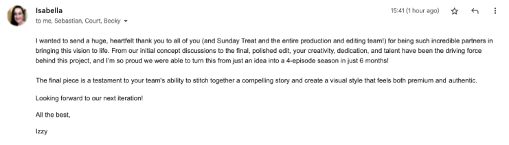 All creative, project management, pre-production, and post-production is handled in-house. On shoot days, we bring in our trusted freelance network – directors, DOPs, art directors, camera operators – to stay flexible and keep costs efficient. We’re really proud of our freelancer community; after all, we started off as freelancers ourselves! They’re part of our bigger team and they all fit into the Sunday Treat culture 👷♂️